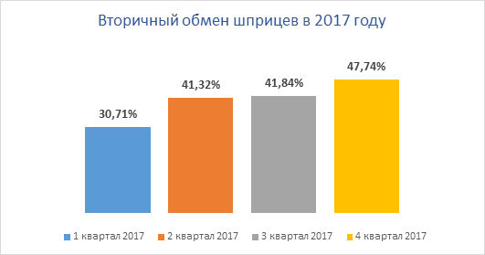 Средний показатель вторичного обмена шприцев в 4-м квартале 2017 г. вырос на 17,03% по сравнению с 1-м кварталом 2017 года. Огромная работа по вопросу обмена шприцев, проводимая в Минске в 2017 году, позволила увеличить этот показатель в Минске к концу года на 33,36% – в 4-м квартале он составил 47,57%. Однако не все пункты смогли удержать показатель первого квартала; социальные работники объясняют это тем, что на обмен шприцев влияют особенности наркосцены и жесткое отношение закона к потребителям наркотиков.