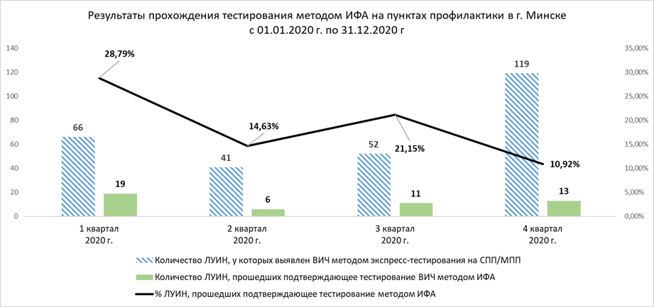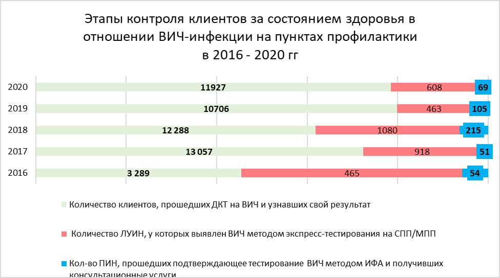 За 2020 год было сделано 13426 экспресс-теста на ВИЧ по слюне, тестированием на пунктах профилактики охвачено 11927 человек, что составило 40,7 % от запланированного годового индикатора.